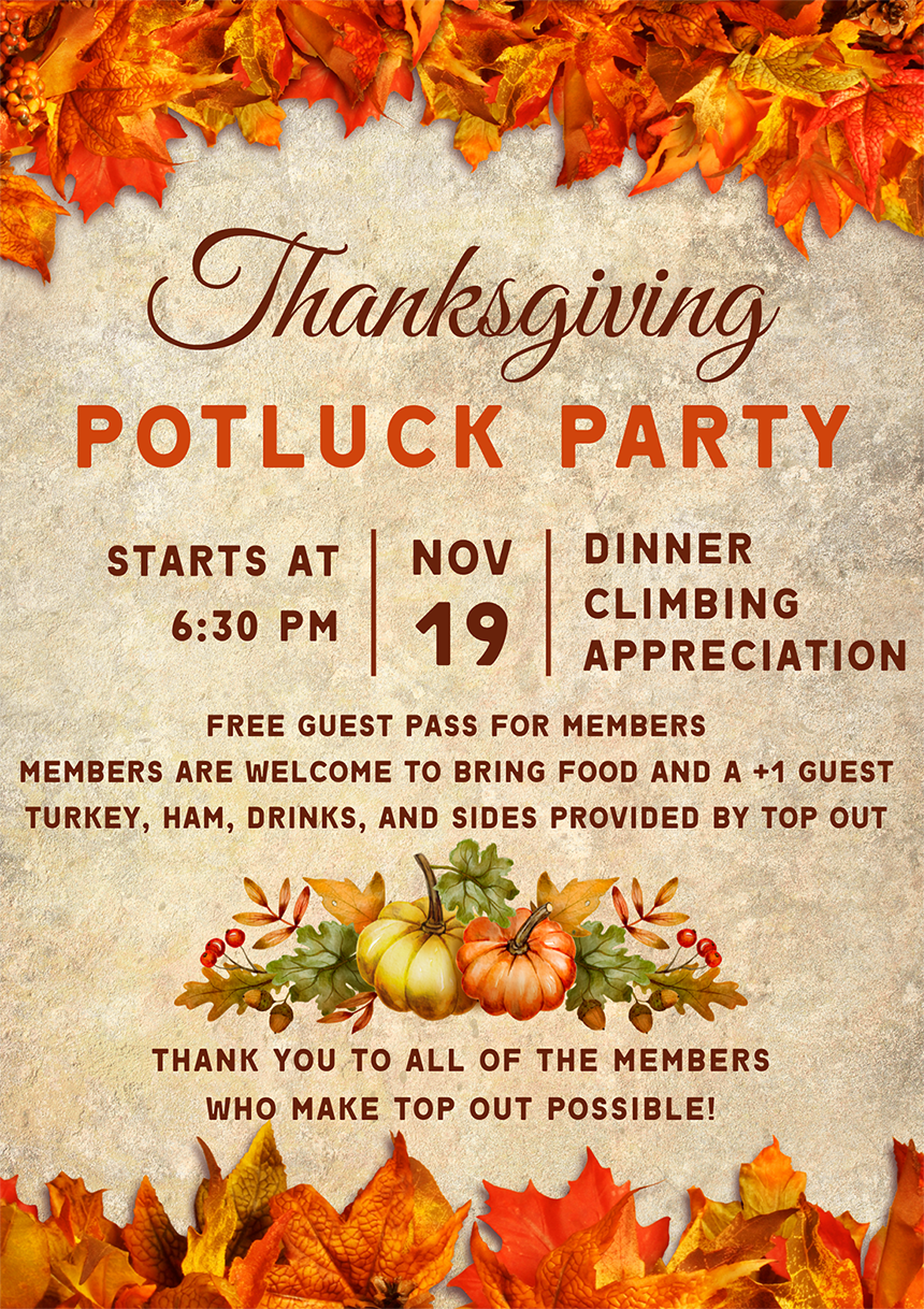 In a season of giving and thanks, we love to celebrate with our members for choosing Top Out as your 2nd home by hosting this fun filled night of food and climbing. Having such a tight knit community is what makes Top Out a special place, and it is always an amazing experience to have so many of our members and loved ones come together to socialize and appreciate one another during our Thanksgiving celebrations.