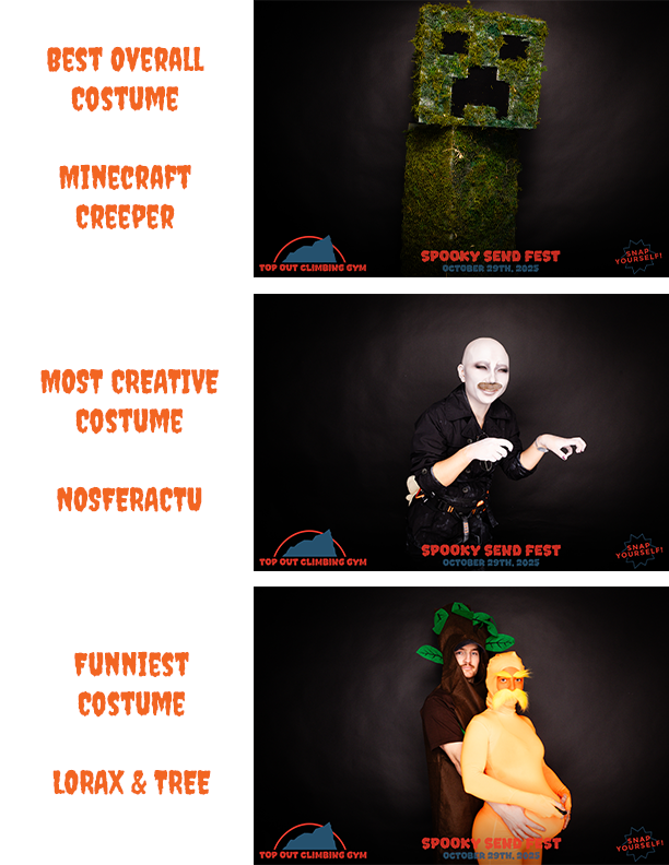 Congratulations to all of the climbers who competed in our bouldering contest. We featured fun and whacky climbs, including a glow in the dark baby head, floating wood planks, and ghostly sheets. Here are your Spooky Send Fest podium finishers for each skill category:
